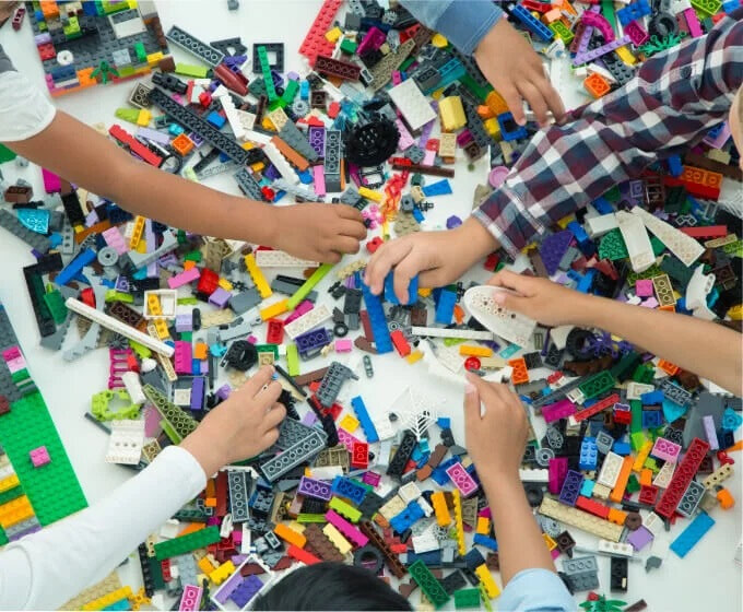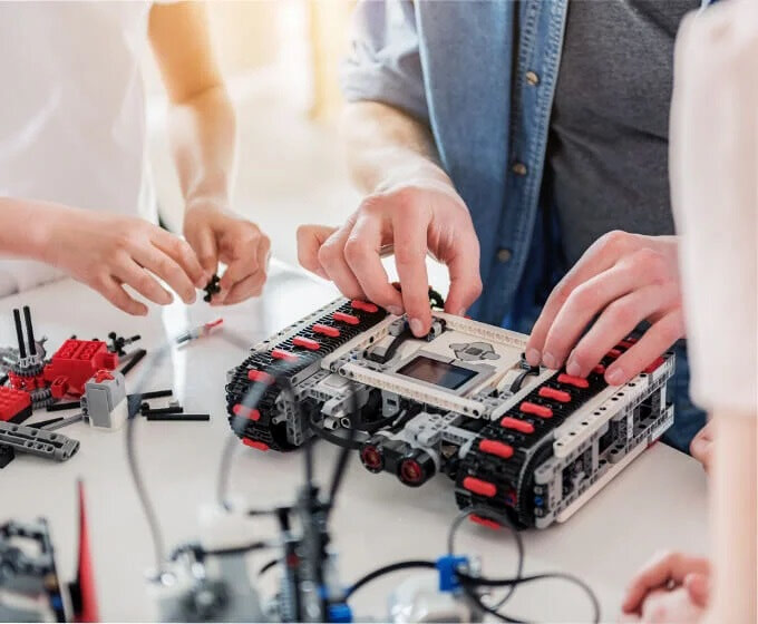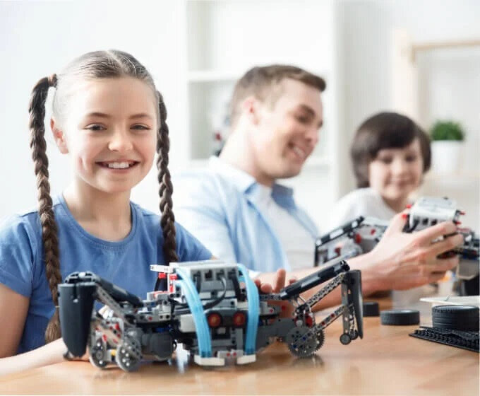 Children engage in game-based learning while building robotos and learning engineering and mathematics principles.